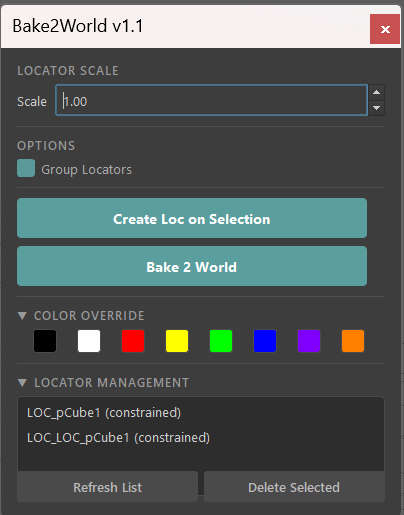 “Bake2World” is a Maya tool designed to streamline the process of attaching locators to any object or component in your scene, calculating the world position of it and bake it onto a locators. Whether you’re working with geometry, joints, NURBS, or components like vertices, edges, or faces, this tool lets you create positioned locators with naming, scalable control, and custom color overrides, Bake its animation and transfer it back and forth