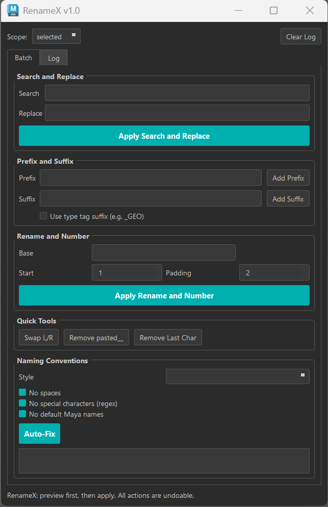 A Maya batch renaming tool with pattern-based renaming, quick utilities, and naming convention enforcement.