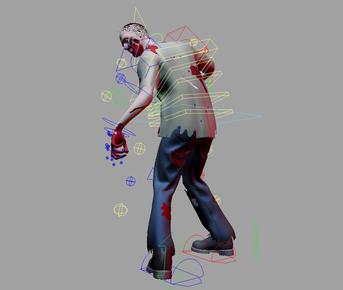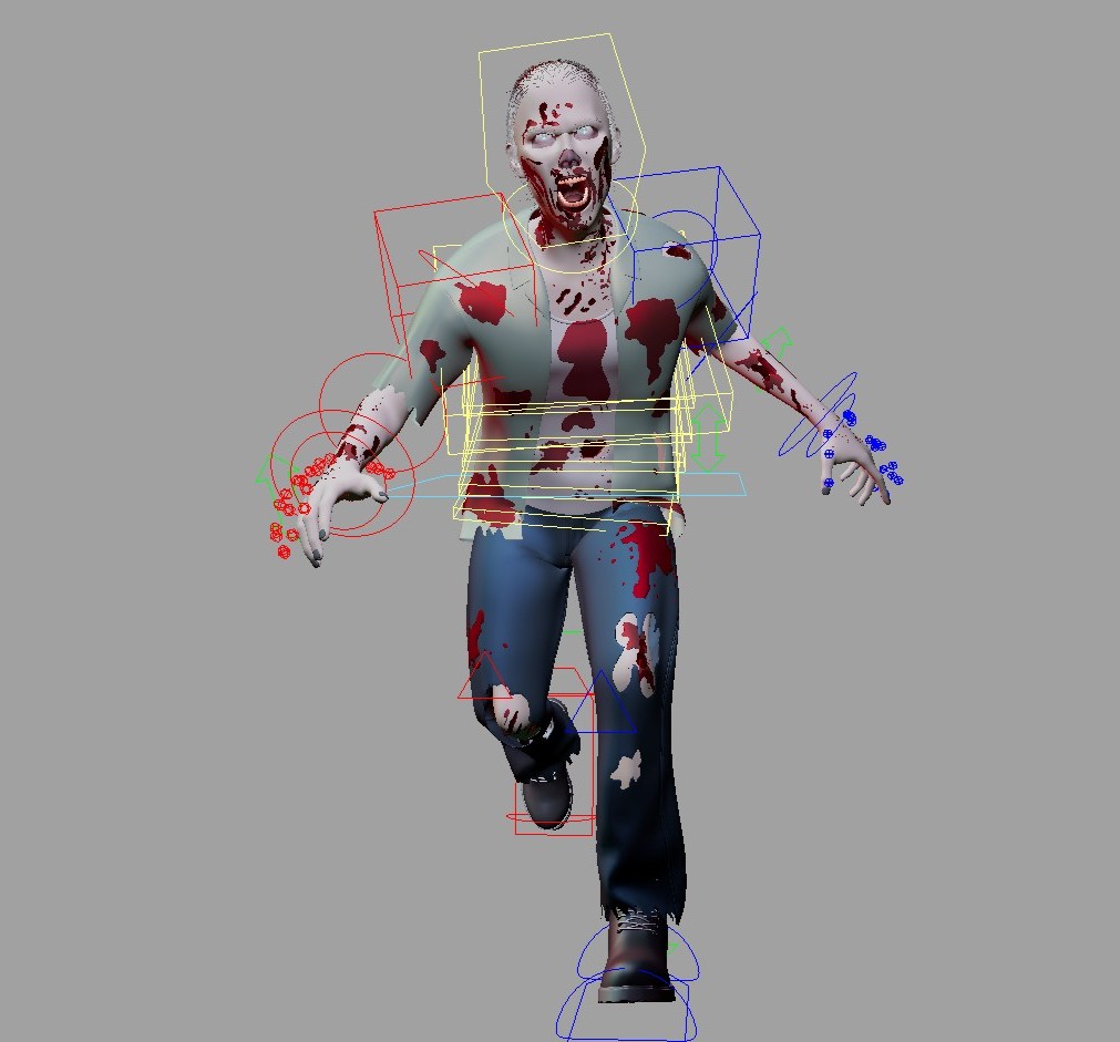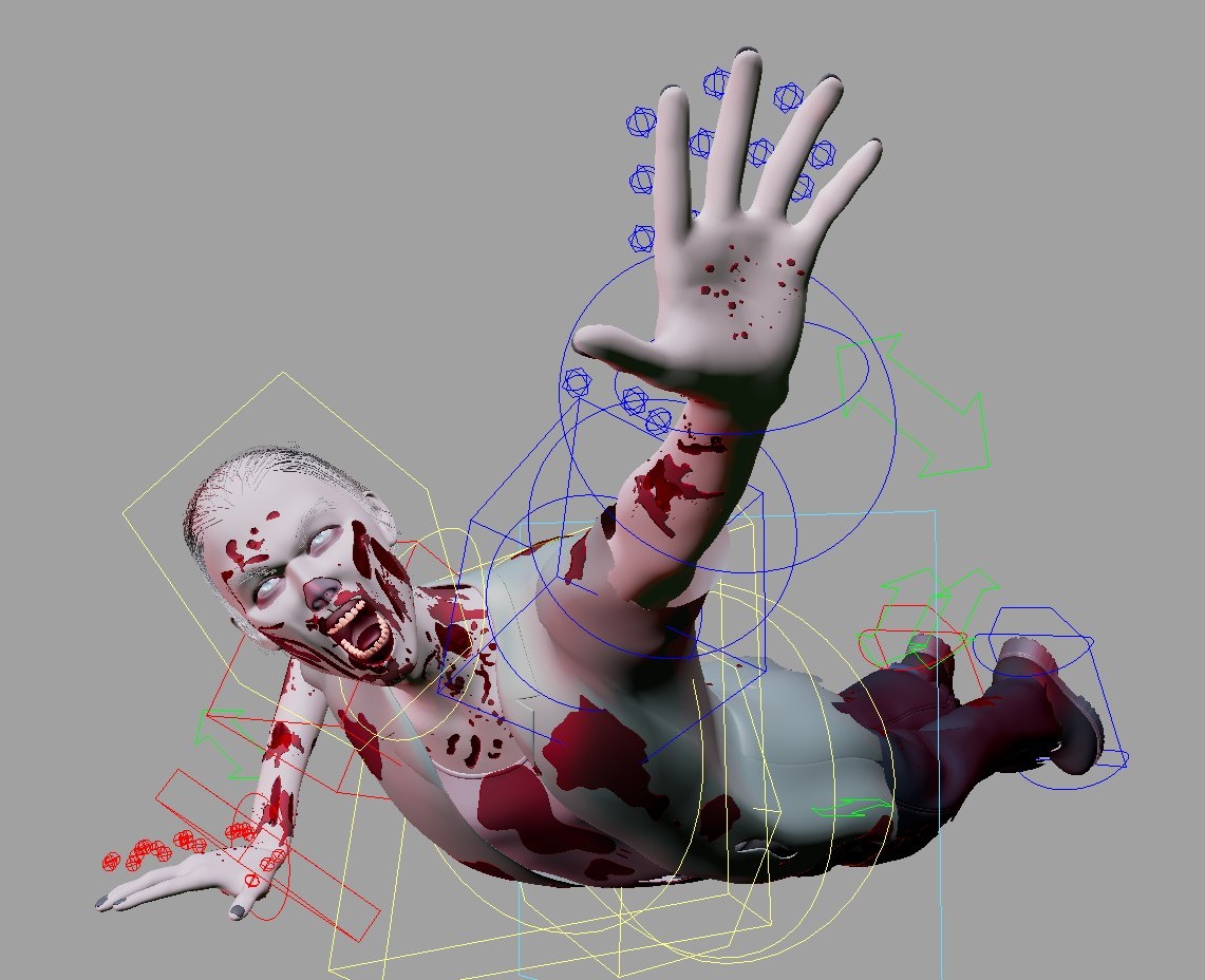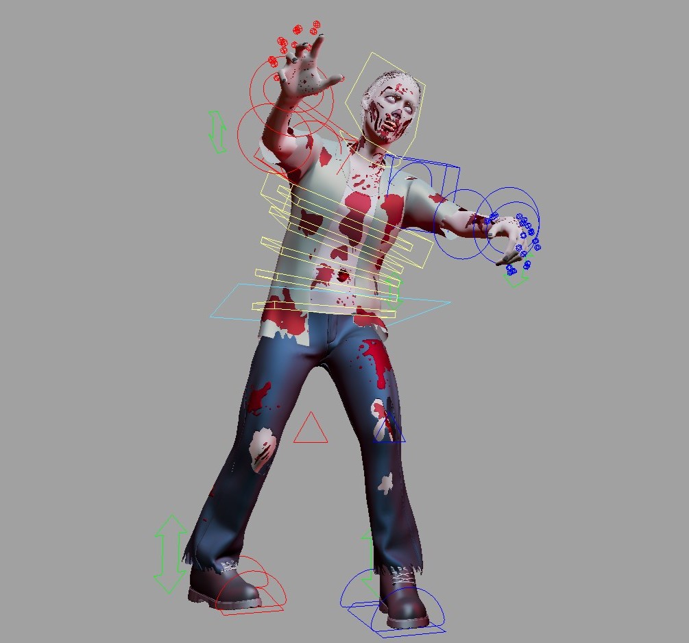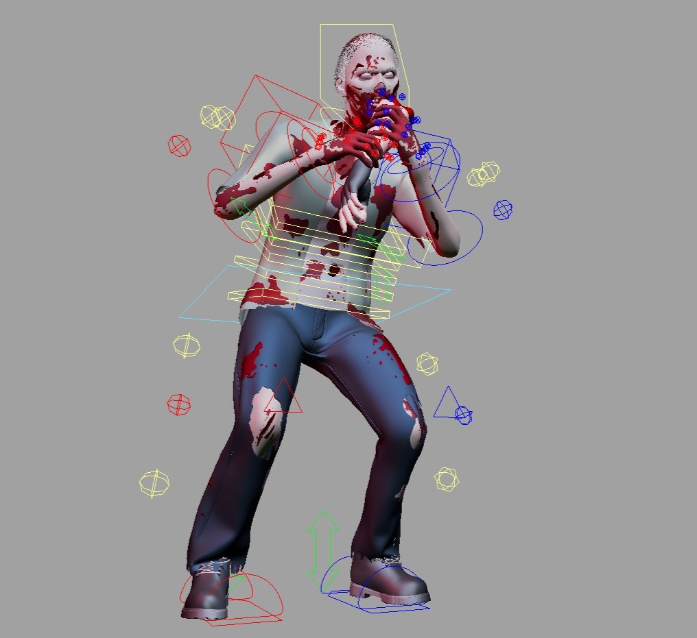 Biped Rig. Includes a face rig that can be toggled on/off via the Head_Ctrl. Other features are visibility switches for bloody hands and mouth, which toggles the visibility for blood geo that are skinned and follow the main rig.